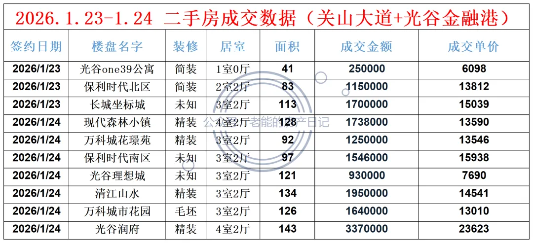 2026.1.23-1.24 二手房成交数据 (关山大道+光谷金融港)