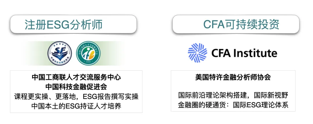 这一点,从企业的岗位JD上就能得到答案,CFA协会的可持续投资证书和国内受到广泛关注的中文权威认证的注册ESG分析师证书。