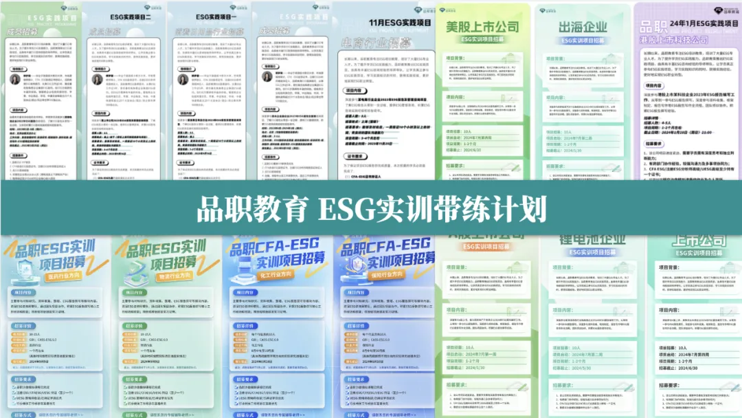 因此我们推出了ESG实训项目,不仅适合0工作经验的ESG职场小白,更适合未来打算跳槽到ESG得到更好发展的转行人,百大企业,资深带练,免费实习。