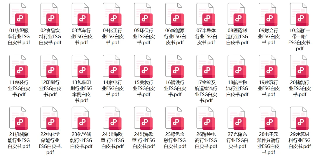 品职汇总了45份ESG各行业深度研究白皮书,包括财会、出海、环保、汽车、能源、建筑、半导体、金融等行业,目前行业还在继续增加中。