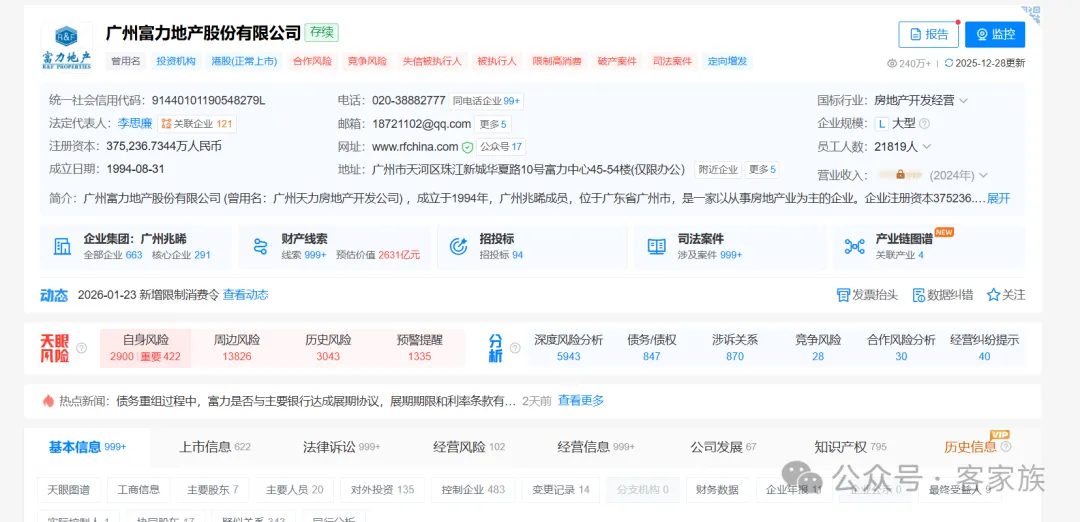 1月21日,富力地产发布公告承认,因未履行支付一笔仅24.92万元的债务及相应利息、执行费用,被山西省临汾市尧都区人民法院列为失信被执行人。案号(2025)晋1002执2767号,执行依据为(2024)晋1002民初1753号民事判决书,立案时间为2025年7月17日——这意味着,法院早在去年下半年就已作出判决,而富力直至今年年初仍未履行。