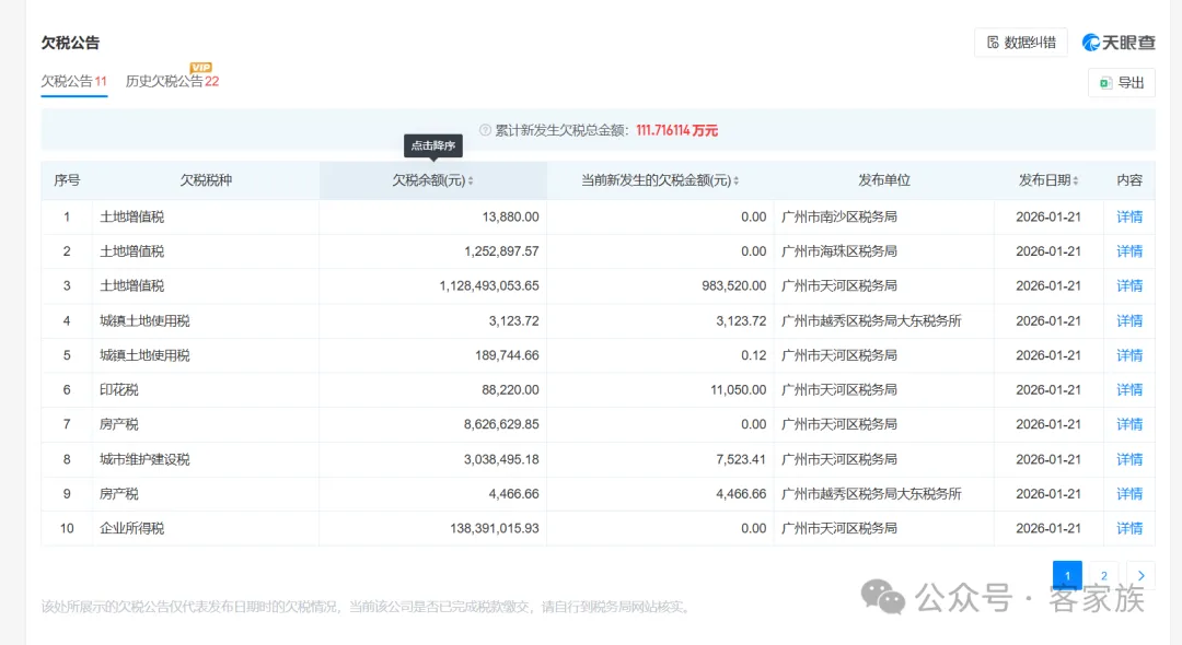 近日,据天眼查“天眼风险”信息显示,广州富力地产股份有限公司新增11则欠税公告,欠税余额合计13亿余元,涉及土地增值税、城镇土地使用税、印花税、房产税等多个税种。