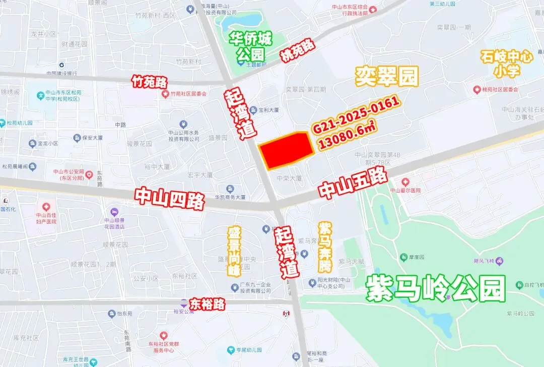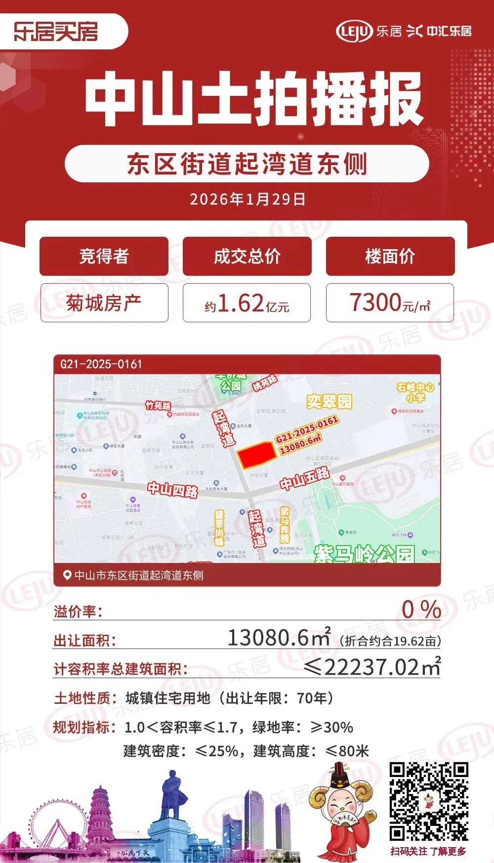根据中山市公共资源交易平台公告,G21-2025-0161号地块最终以起始总价约1.62亿元、楼面地价7300元/㎡底价成交,溢价率为0%,由菊城房产成功竞得。