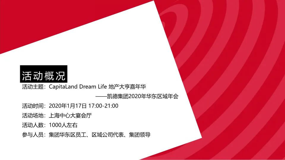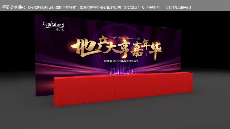 本方案为凯德集团2020年华东区域年会策划案。活动以“CapitaLand Dream Life 地产大亨嘉年华”为主题,旨在通过沉浸式互动体验,回顾成就、激励员工、树立品牌。核心创意在于将年会设计成一场大型“大富翁”游戏,从签到领取“起始本金”开始,贯穿五个区域互动闯关,最终兑换奖励。流程分为“相聚、敬自己、竞未来”三大篇章,包含灯光秀、领导致辞、奥斯卡式颁奖、创意节目及丰富互动游戏。整体策划强调员工参与感、归属感与企业文化的深度融合,形式新颖,细节丰富。