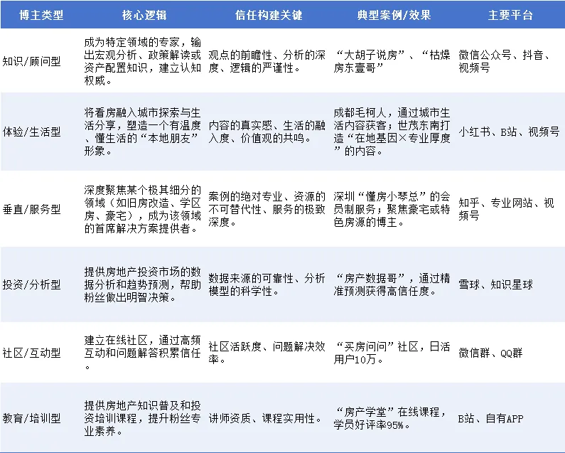 尽管目标一致,但不同资源与特长的经纪人,可以采取差异化的路径来构建信任。目前,市场上较为成功的房产博主主要分为几种类型: