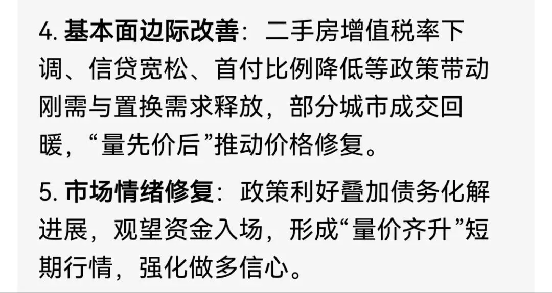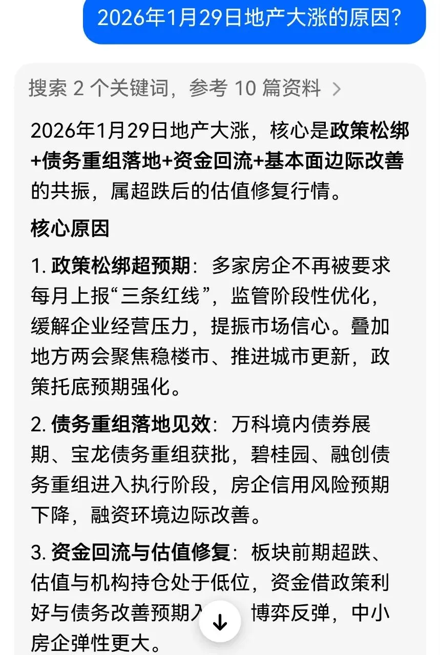 为了验证一下真伪,我还特意去豆包搜索了原因,基本上可以确定这个消息就是推动地产今天上涨最直接的原因,至于其他的理由都有点牵强!