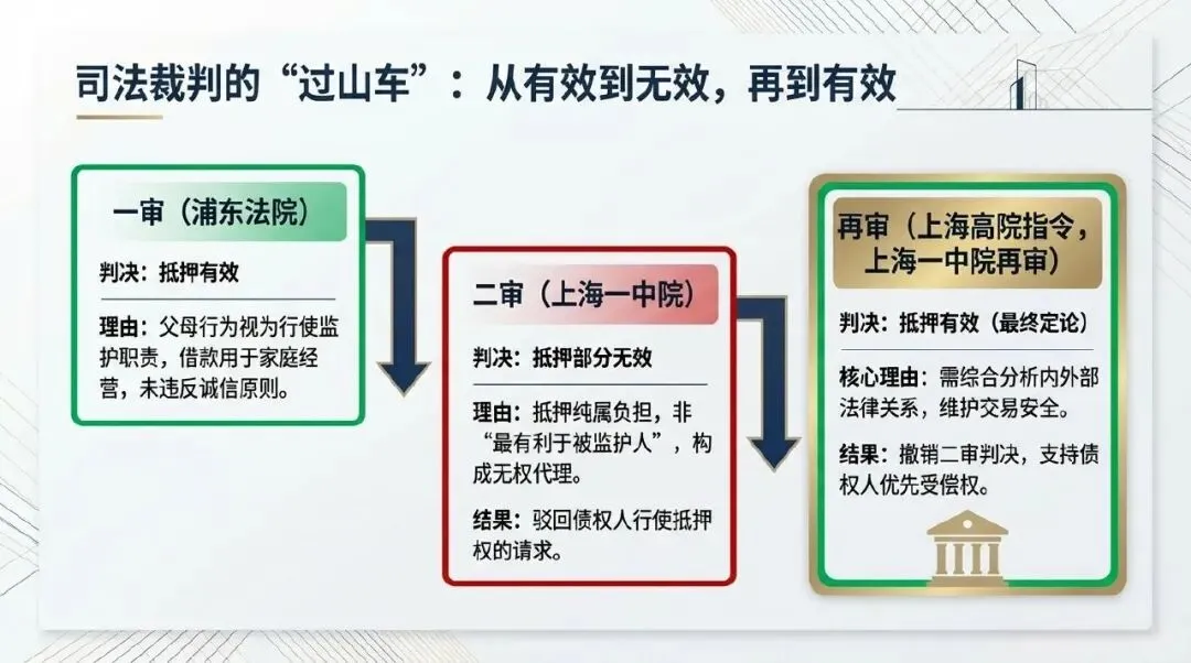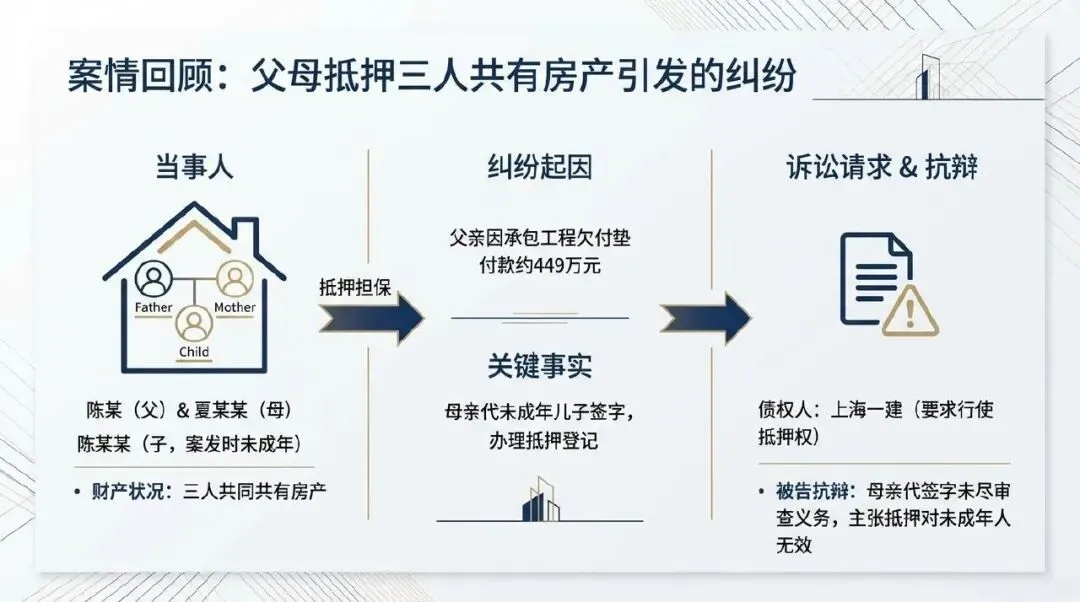 上海一起标的额超 449 万元的工程垫付款纠纷中,父母以家庭共有房产为经营债务抵押,母亲代未成年儿子签字,这份抵押合同历经一审有效、二审无效、再审改判的 “反转” 历程。看似简单的签字行为,背后却暗藏 “最有利于被监护人” 原则的学理争议、家庭共有财产的处分规则,以及内外法律关系的效力认定难题。
