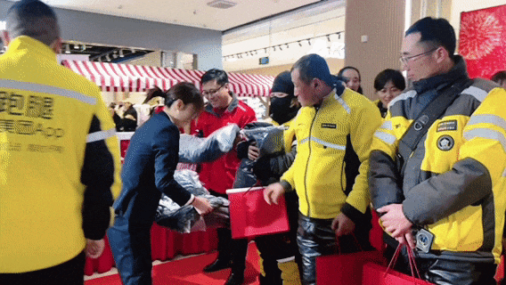 兴商地产党支部书记董宇,兴商地产经纪事业部总监景东凯、张连兵,为骑手们递上兴商羽绒服,只为让奔波的骑手们“穿得暖、跑得稳”。