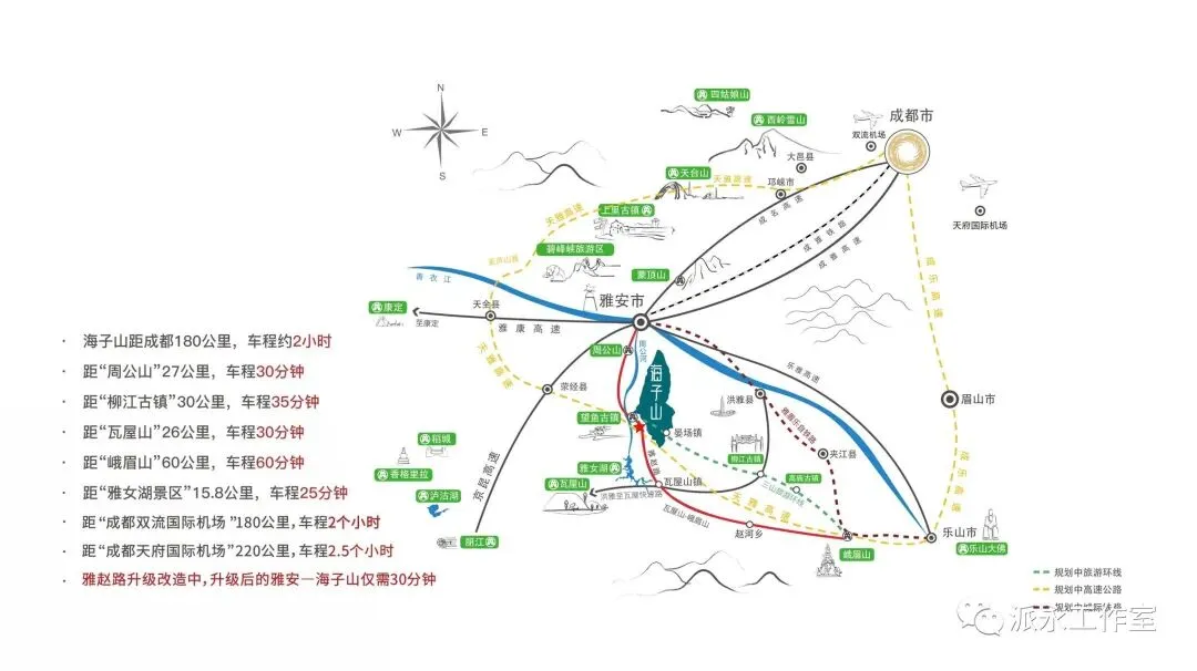 海子山地处川西旅游康养咽喉之地,距成都180公里,2小时直达成都市区;距“周公山”、“柳江古镇”、“瓦屋山”、“雅女湖景区”均在30公里范围内,车程约25分钟;1小时车程直达峨眉山、青城山、乐山等旅游风景区;距贡嘎雪山直线距离100公里。地处京昆高速、雅康高速、乐雅高速以及遂洪高速所形成交通矩阵的中心地带,距离成都、青城山等川内商业枢纽或旅游点均不超过200公里,享受大川西全域旅游资源,是真正意义上的两小时旅游经济生活圈。