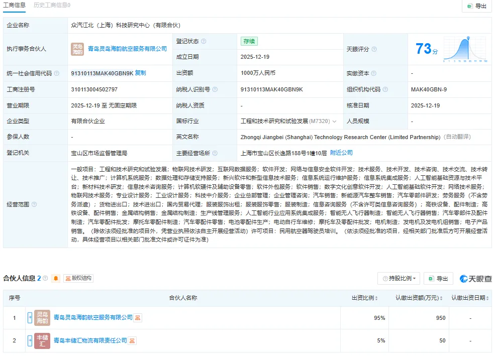 根据天眼查数据,其控股股东为众汽江北(上海)科技研究中心(有限合伙),成立于2025年12月19日,位于上海市宝山区,主要从事工程和技术研究和试验发展,企业规模为中型。上海科技研究中心对济南制造公司的持股比例为95%,认缴出资额为28500万元人民币。这意味着上海科技研究中心是济南制造公司的实际控制方。