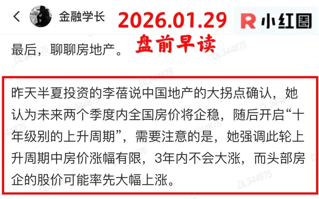 今天A股的指数波澜不惊,但地产和白酒突然集体爆发,连低调的茅台甚至都逼近涨停,这是为什么呢?接下来我们一帧一帧来分析。李蓓说,中国地产的大拐点已确认,她认为未来两个季度内全国房价将企稳,随后开启“十年级别的上升周期”,需要注意的是,她强调此轮上升周期中房价涨幅有限,3年内不会大涨,而头部房企的股价可能率先大幅上涨。