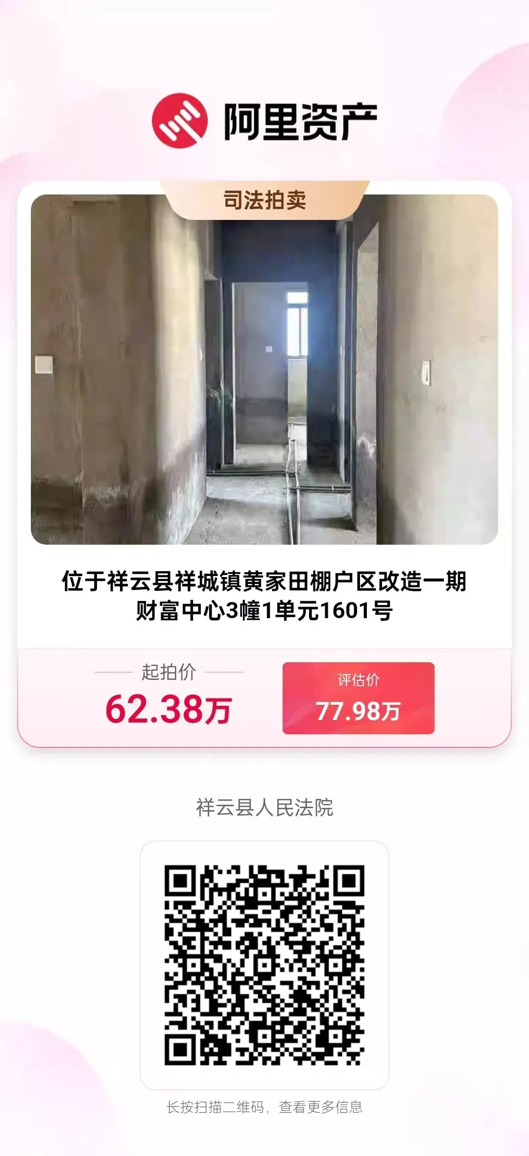 关于位于云南省祥云县祥城镇黄家田棚户区改造一期财富中心3幢1单元1601号房产一处拍卖公告(二拍)