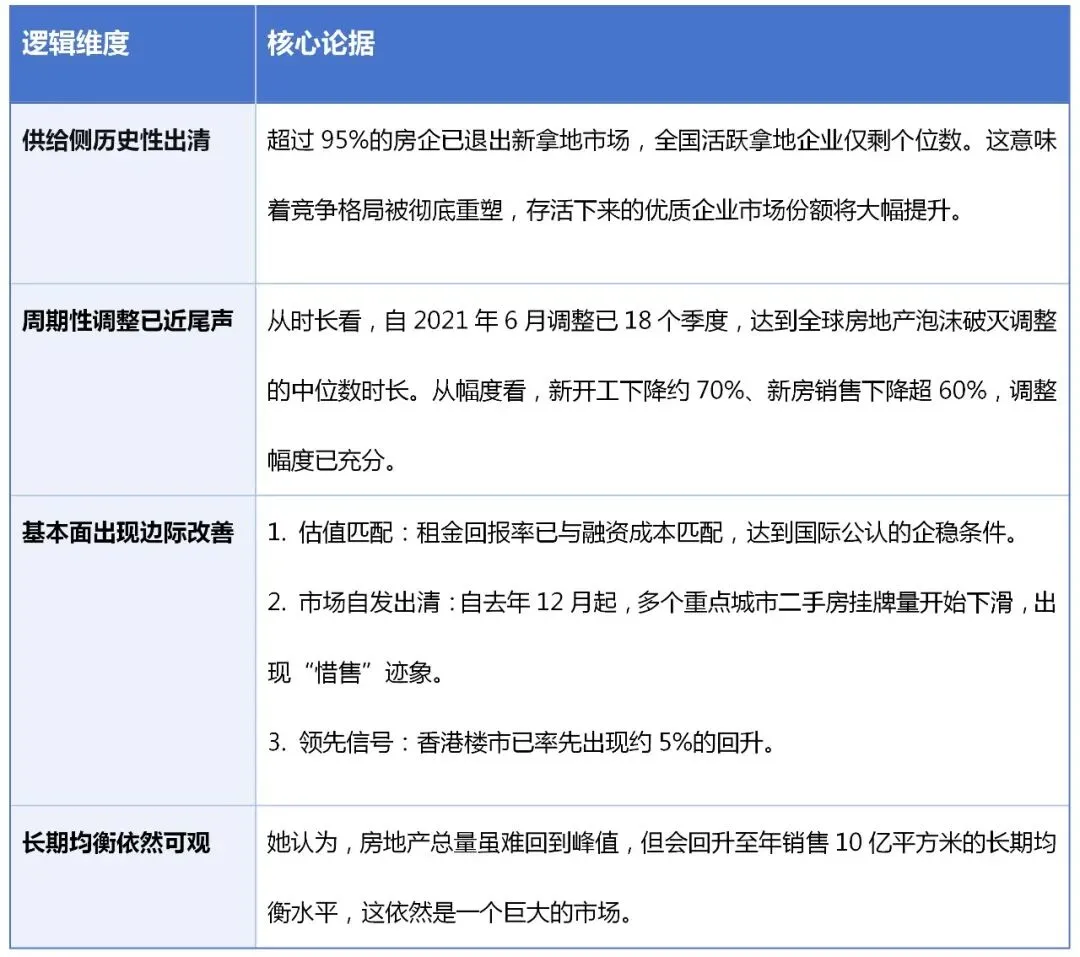 基于上述判断,她认为行业在逐步见底之后,将面临十年级别的回升周期,未来地产股的机会不在房价或销量回升,而在供给出清后的企业份额扩张与盈利能力修复。