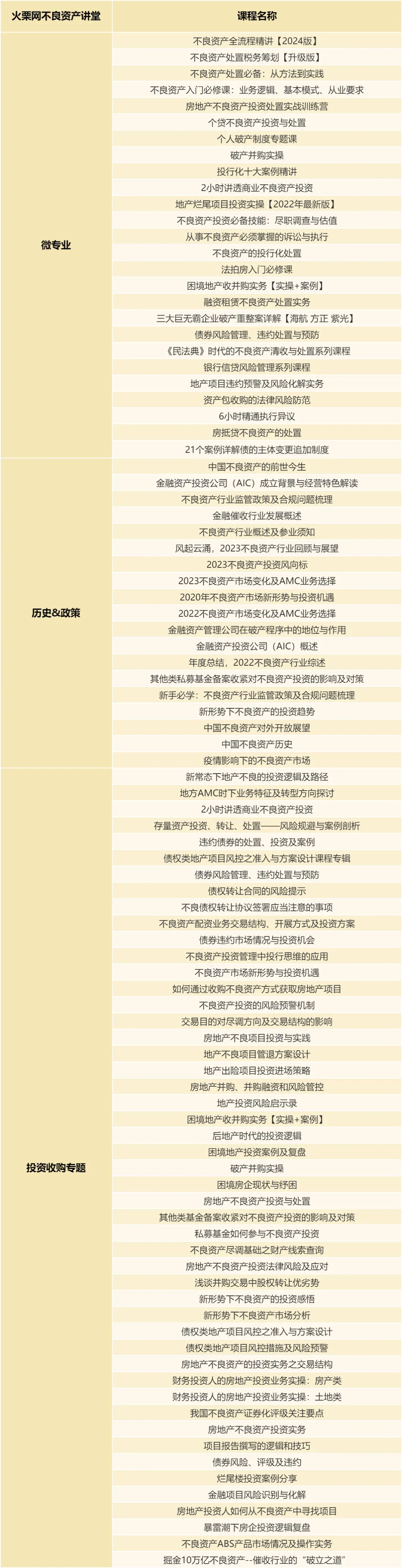 除了《房地产不良资产投资处置实战训练营》之外,火栗网共拥有16000分钟、400+课时专业线上课程火栗网共拥有超200位不良资产行业讲师,讲师全部是常年工作在不良资产第一线的全国性AMC、地方AMC、国有大行、股份制银行、头部证券公司、服务机构关键岗位的核心人员,均拥有超10年的从业经验,拥有丰富的不良资产投资、收购、尽调估值、处置实战经验。
