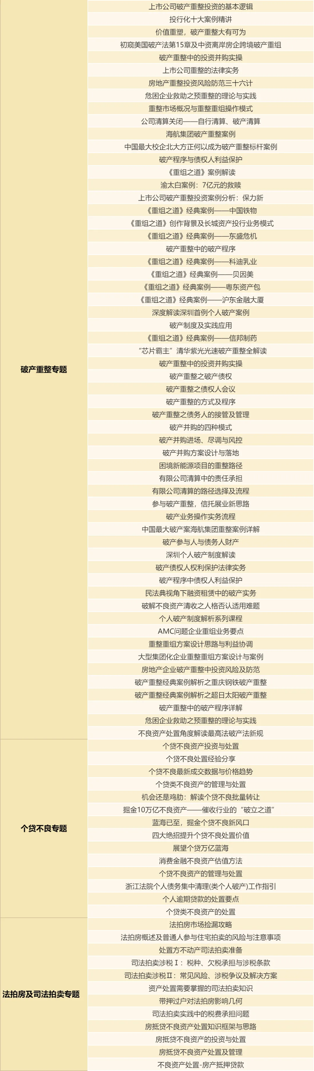 火栗网创始团队出身于四大AMC,针对行业痛点与AMC业务需求策划系统性的不良资产课程,内容涵盖传统资产包或项目的尽调、估值、投资、处置全操作流程,并针对破产重整、个贷不良、房地产不良、抵债资产、不良资产证券化、商业综合体盘活运营等细分领域设计了多套系列课程。课程讲授过程穿插大量讲师亲自操盘案例,深入浅出,体系化与实操性并行。除此之外,课程随着市场形式变化、政策法律法规变动,处置方式迭代等不断更新。