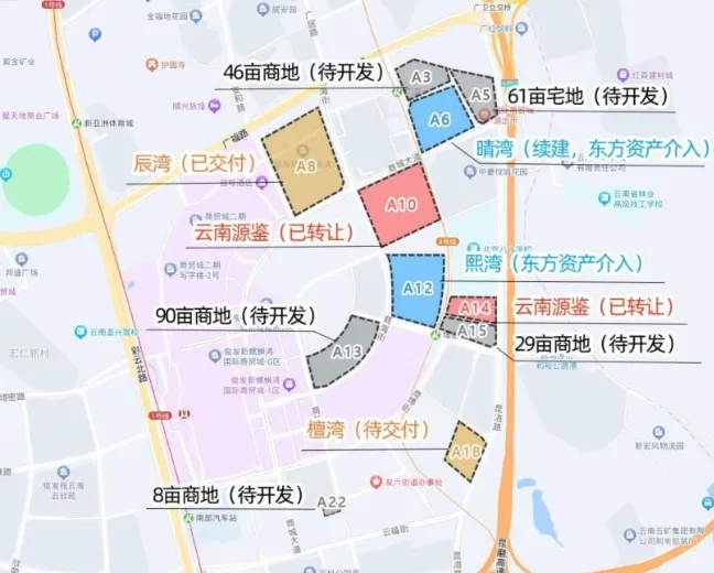 对于深耕云南楼市的东方资产来说,吃透了“云南王”俊发地产的资源,也成为龙湖、绿城等房企紧紧跟随的合作伙伴。俊发地产曾是昆明市销售规模最大的房企,号称“云南王”。2015-2017年,实现销售分别为131亿元、190亿元以及381.3亿元,两年时间完成了销售规模翻三倍的增长,堪称“三级跳”。2020年俊发地产形势急转直下,2017年定下的千亿目标正式落空。2022年12月,港股上市的俊发地产正式宣布旗下债券违约,彼时,俊发地产董事长李俊称表示,俊发集团正在和多家大型央企、国企对接项目合作、资产处置等事宜,预计将回笼上百亿资金,回笼的资金足够覆盖今年所有的工程支付和还本付息。2024年,东方资产通过一系列复杂的股权变更,成功拿下“云南王”俊发地产巨无霸项目的多宗地块。该项目是位于昆明的彩云城,占地面积超过千亩,共划分了11个地块,俊发地产在债务危机后转让了彩云城一些地块,这个巨无霸项目早已四分五裂,还有A3、A5、A13、A15、A22等5个地块尚待开发。替东方资产出面拿下彩云城A6和A12地块的是东方资产旗下东银实业,两宗土地总面积超过200亩。项目公司股权变更后,东方资产掌握了两宗地块的话语权。随后,东方资产与绿城管理、中国交建一公局合作,绿城负责运营操盘,中国交建承担施工,彩云城A6和A12地块预计2026年竣工。