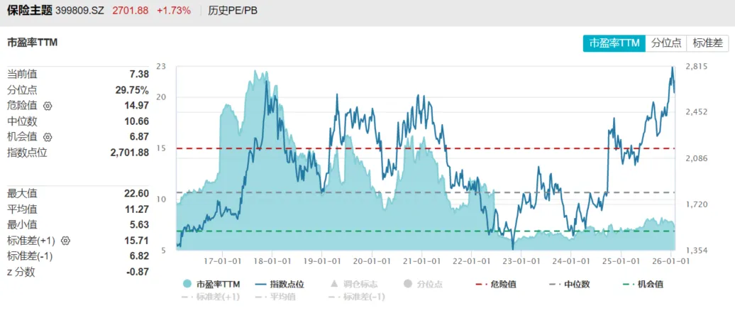 保险板块同样处于历史估值低位。保险板块当前市盈率约7.4倍,历史分位水平在29%左右,市净率约为0.83倍,处于历史约31%分位水平。在利率环境趋于稳定、保费收入回暖、投资端预期改善的背景下,保险行业基本面呈现边际向好态势,但估值修复尚未充分体现。