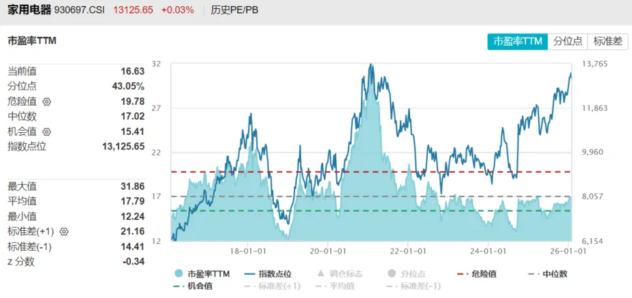 家用电器板块市盈率约16.6倍,历史分位点约43%,同样处于历史偏低区间。市场对房地产产业链的担忧在一定程度上抑制了家电板块整体的估值表现,但受益于技术赋能、供应链优化及品类创新实现效率与盈利的提升,同时全球化与出海开拓增量市场,叠加低估值、高股息等特征,家电板块当前位置或许具备较强的确定性。