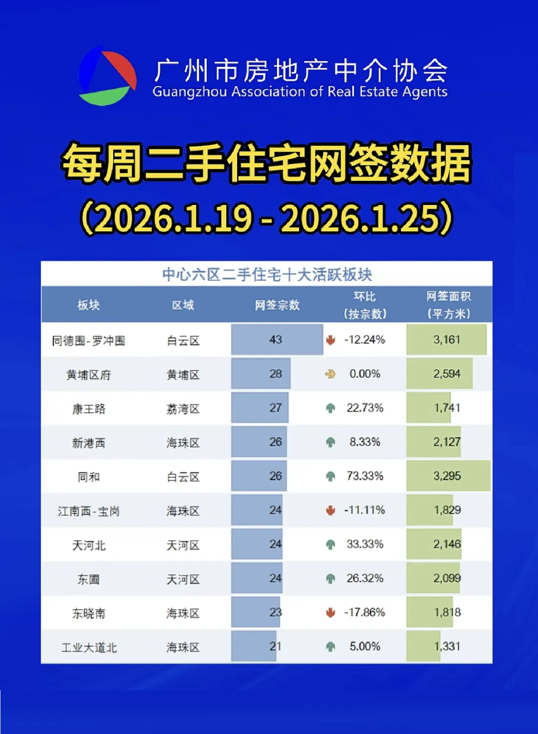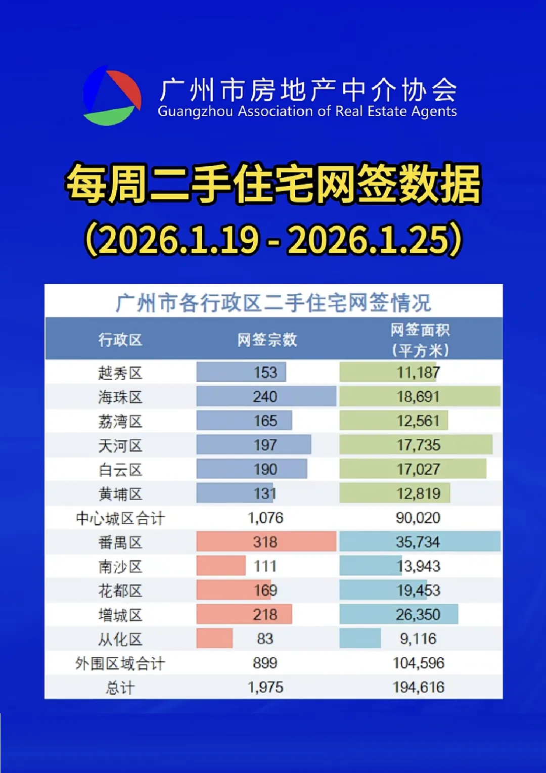 2026年1月19日~2026年1月25(数据来源:广州市房地产中介协会),广州存量二手房累计网签1975 套,网签面积 194616㎡,比上周减少 111套,环比降幅(按宗数)5.3%,各行政区成交量各有涨跌。