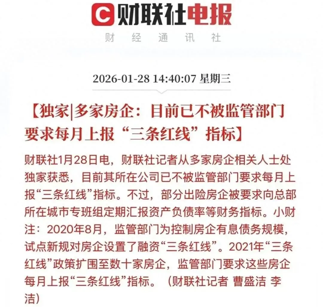 1月28 日下午,财联社披露一则重磅消息:多位房企相关人士证实,监管部门已不再要求其所在公司按月上报 “三条红线” 指标。这一举措被市场解读为房地产行业的重大利好与政策松绑,释放出远超 “监管减负” 的深层信号。