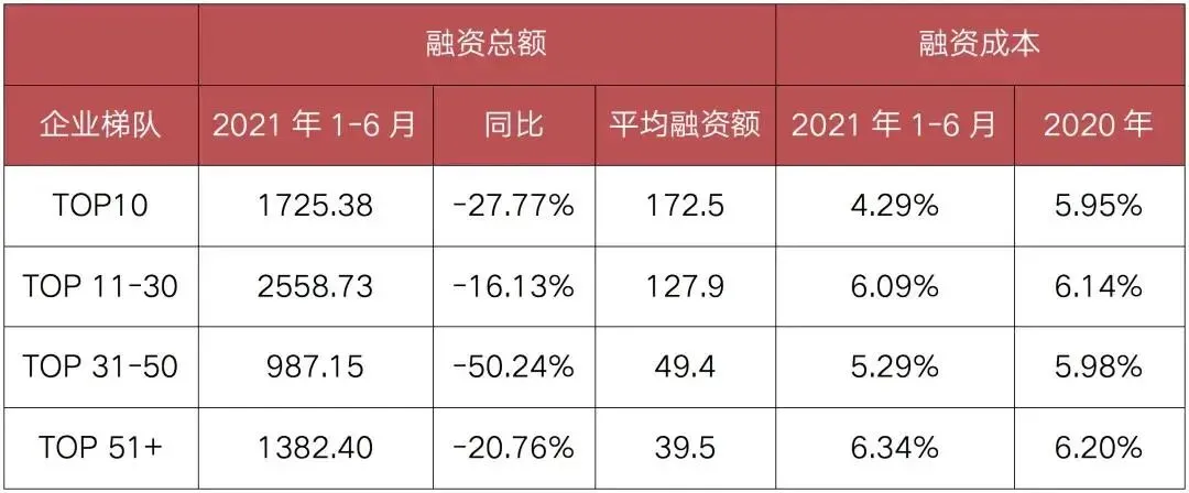 设定房企剔除预收款后的资产负债率≤70%、净负债率≤100%、现金短债比≥1.0 倍三大硬性指标,直接收紧房企银行贷款、信托、债券等各类融资渠道,成为房企经营的核心约束。据CRIC 统计显示,2021 年上半年 100 家典型房企融资额仅为 6090 亿元,同比大幅下滑 34%,环比下降 29%,其中中型房企受冲击最甚,部分企业融资规模近乎腰斩。