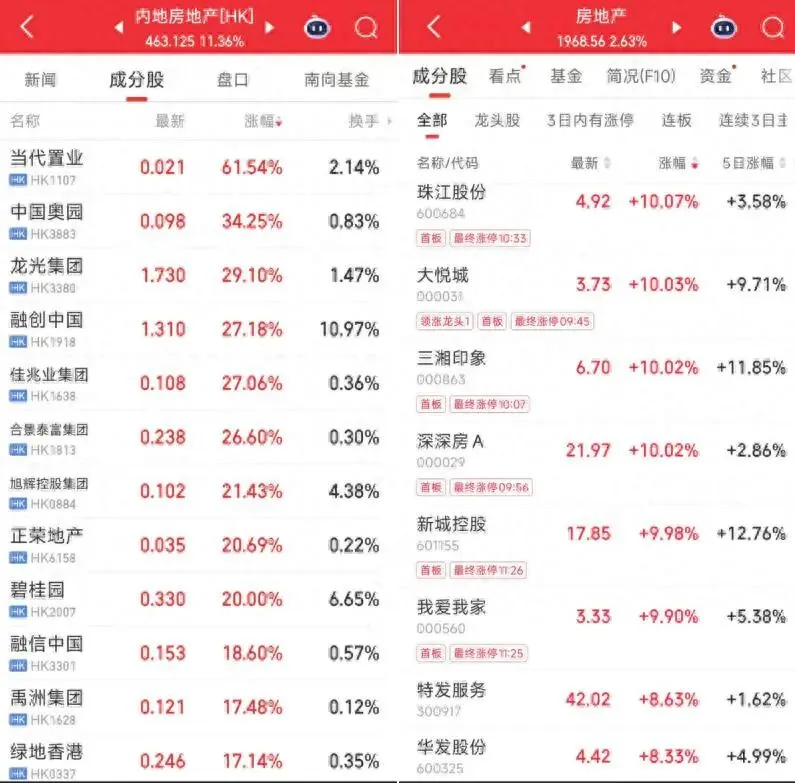 政策利好迅速传导至资本市场,A 股、港股房地产板块应声反弹