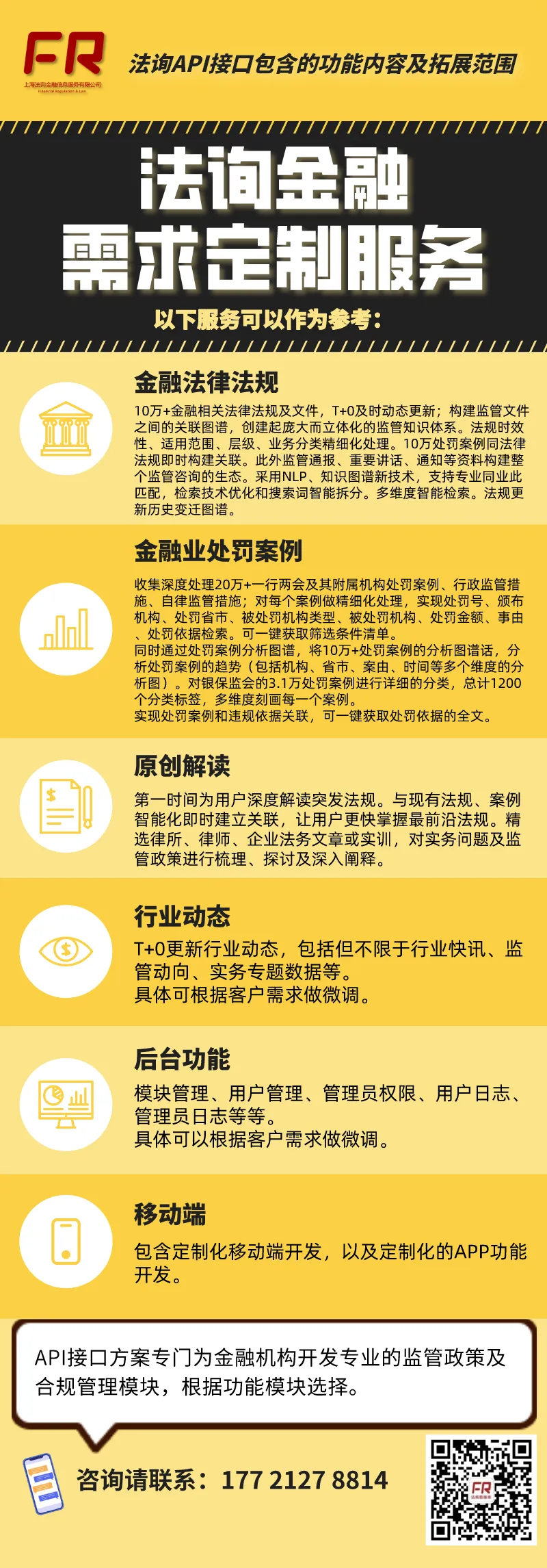 法询智库是专业级金融监管文件数据库,可登录www.banklaw.com,点击右上角注册(手机号、单位部门信息),完成注册后小助手联系开通试用。详细处罚案例分析报告、金融法规数据服务,可联系助手微信13671816814。法询智库提供成熟的分析工具及底层数据,可以提供API接口或数据植入式等多样性服务。