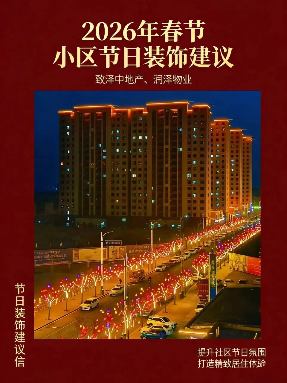 值此2026丙午马年春节来临之际,我们怀着对家园的热爱与期盼,特向贵方提出建议:在各小区合理布置符合春节氛围的装饰品、灯饰品(不是简单应付),营造喜庆、温馨且兼具传统韵味与现代美感的节日氛围,让业主一踏入小区便能感受到浓郁的年味,在归家途中便卸下奔波疲惫,沉浸于团圆佳节的温暖之中。