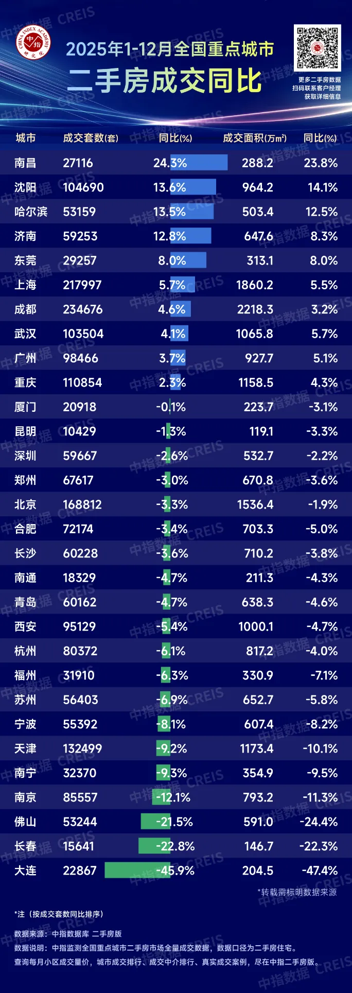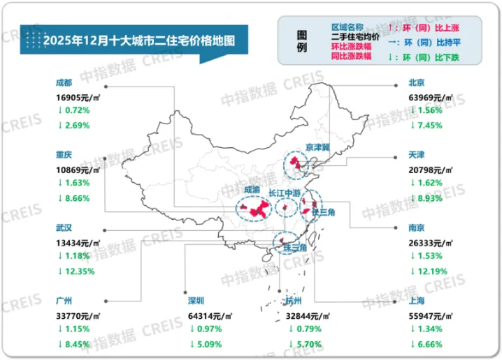 根据中国房地产指数系统百城价格指数,2025年12月,百城二手住宅均价环比下跌0.97%,同比下跌8.36%;十大城市二手住宅均价环比下跌1.25%,同比下跌7.32%。