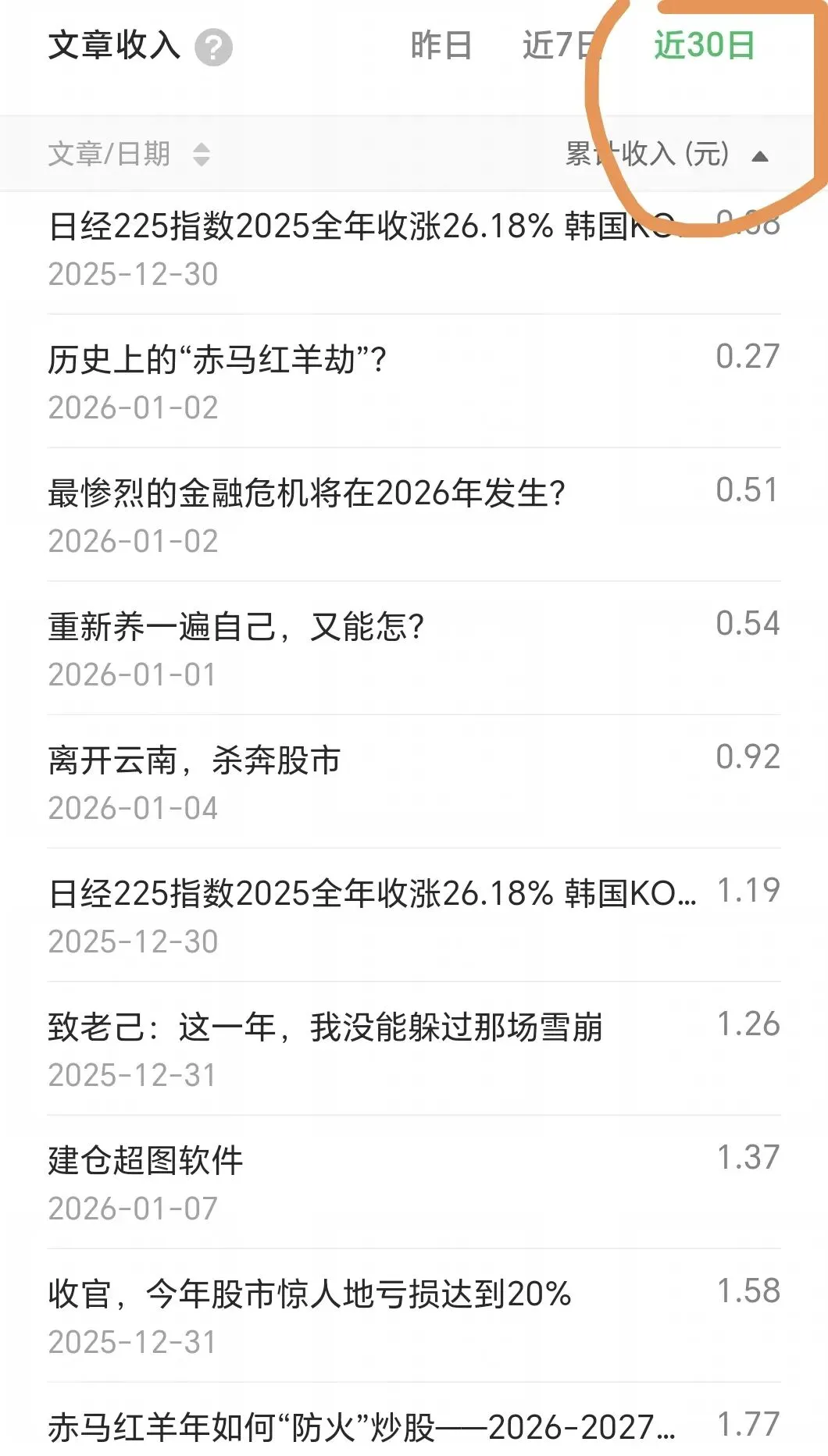 这是我每天写文章的收入,最近30天,最高的一天2快多钱。