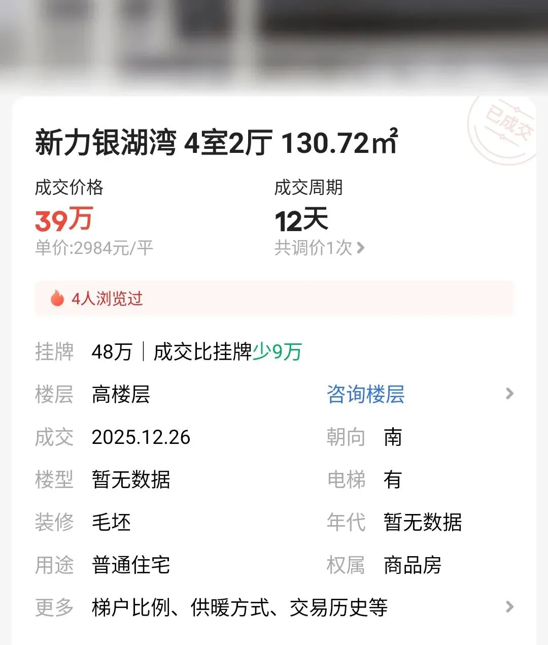 此次成交的房源为建筑面积约130.72平米的四房,位于16层住宅的高楼层。挂牌价48万,最终降价9万,以总价39万、单价2984元/㎡成交。*本文数据仅指某单个二手房平台,仅做分享参考,不代表整个市场,实际以官方为准。