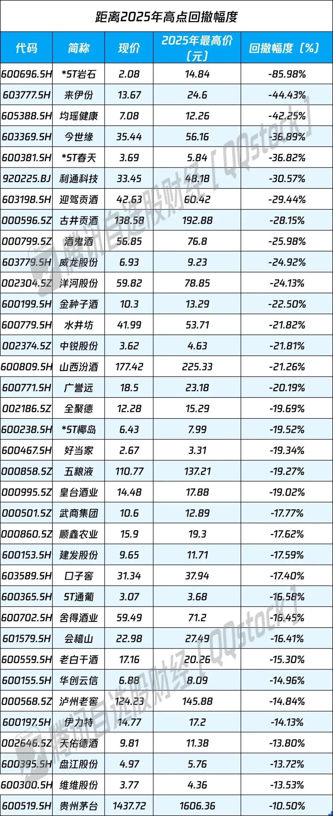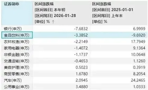 要说近一年来“最惨”的板块,白酒必不会缺席。Wind数据显示,在申万一级行业中,食品饮料在2025年以约9.7%的跌幅垫底;2026年以来,截至周三(1月28日)收盘,跌幅(3.38%)也排在第二。