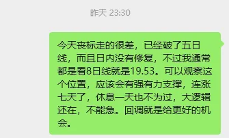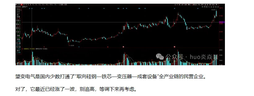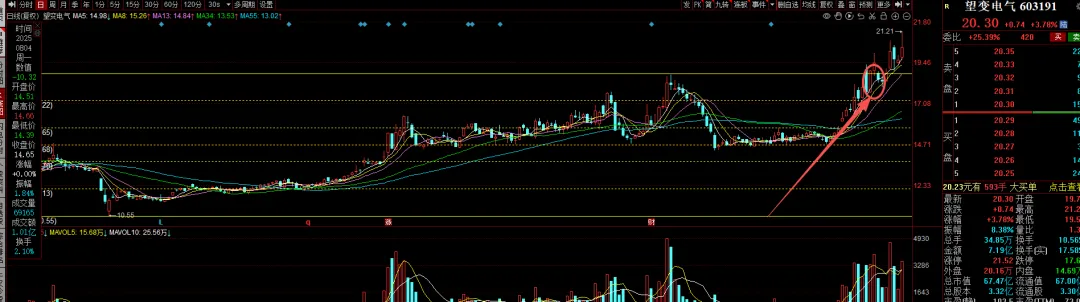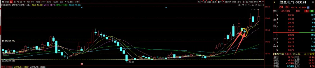 但是这次我定性为:没有了方向,所以转向了低位的白酒和地产,持续性有待考证。其一:这次行情发生了很大的变化,不适合套用。慢牛趋势!其二:有色,商业航天,AI应用都没有趋势都没有完全走坏,主线还在其三:白酒地产是真的跌的太多了,稍微有点资金就能拉起来。上面是我对今天白酒上涨的看法,持续性我也看不准,但是现在白酒算上今天的上涨位置也不高,现在买肯定亏不了,时间不确定。以望变电气做例子。当时推荐的逻辑可以翻翻上面的文章去看。现在也涨到了一个对数顶,所以不做推荐,只做回测。当时推荐的时候就说要等回调可以介入,现在复盘一下为什么这样说!当时推荐的时候是在图中标识这个位置,突破前面压力位,但是未能突破前天高位但是量能比前天差不多,说明关注资金还是比较多,关注资金比较多并且当天未能走出阳包阴,原因无外乎就是资金出逃亦或吸筹不够,需要再次打压积存力量。看走势分析就是积存力量,会再次洗盘,所以说的回调再介入,不要再第二天追涨。(这里走势分析可以看当天低点位置是否低于前天低点位置)还有一点就是如果第二天走突破,经验告诉我们,第一次突破伴随的大概率回调震仓,除非主线特别强。看图。五日线还有十日线,我用的是八日线,不想调来调去了。观察一下前面走势,很少破五日线,就算破了,大部分在十日线就能止住,所以最佳买点就是这两个位置,只要认知能够达到,就不要害怕它会跌下去吗,可以大胆买。就好像昨天的丧彪一样,这里道个歉:昨天有事没有及时更新文章,但是和朋友交流了一下我可以大胆地说回调就是机会,这就是认知偏差。后面还有没有机会我不敢确定,但是今天这样的走势还是可以预料的。