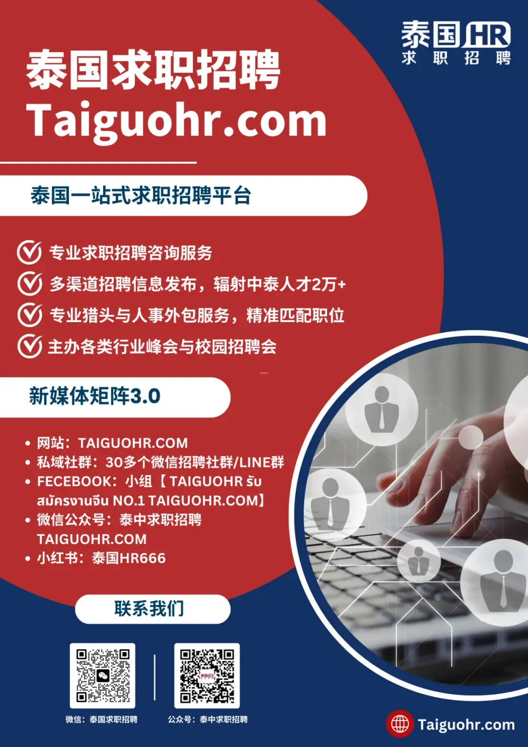 4. 假期:非泰籍——5天/季度; 泰籍:泰国法定假日。依国籍类别进行休假选择。