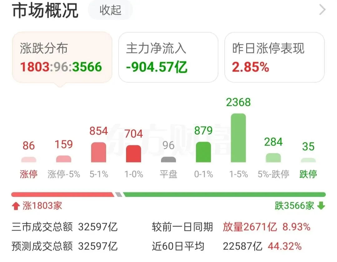 共3566家上涨,1803家下跌。已经连续四五个交易日3000多家股票下跌。