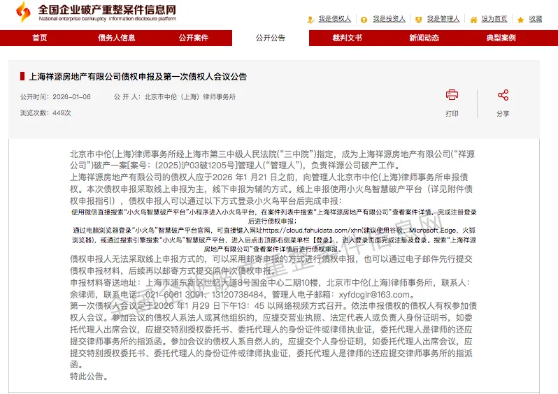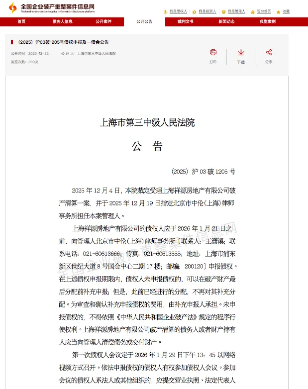 全国企业破产重整案件信息网显示,上海祥源房地产有限公司的破产清算案号为(2025)沪03破1205号,法院已指定北京市中伦(上海)律师事务所作为管理人,并于2026年1月6日发布债权申报公告。