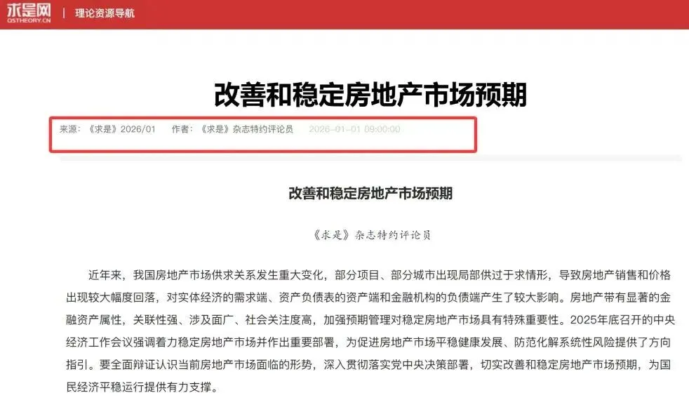 开年以来,《求是》最近快成房地产杂志了!从1月第一期《求是》杂志开始,围绕“房地产”和“城市”发文已经过于密集,2026年《求是》新年第1期,头版头条发表了第一篇文章《改善和稳定房地产市场预期》(这篇最重要)。