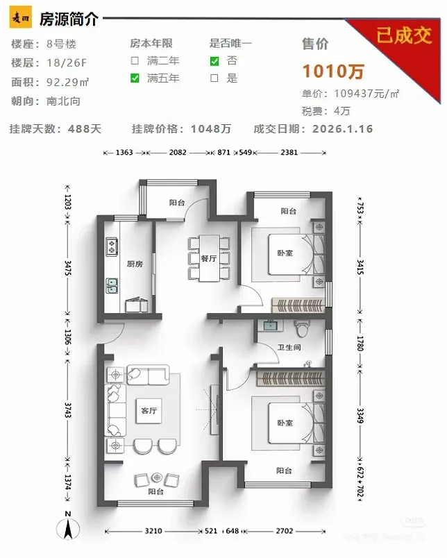 2026年1月:1010万(8号楼18层带东窗)