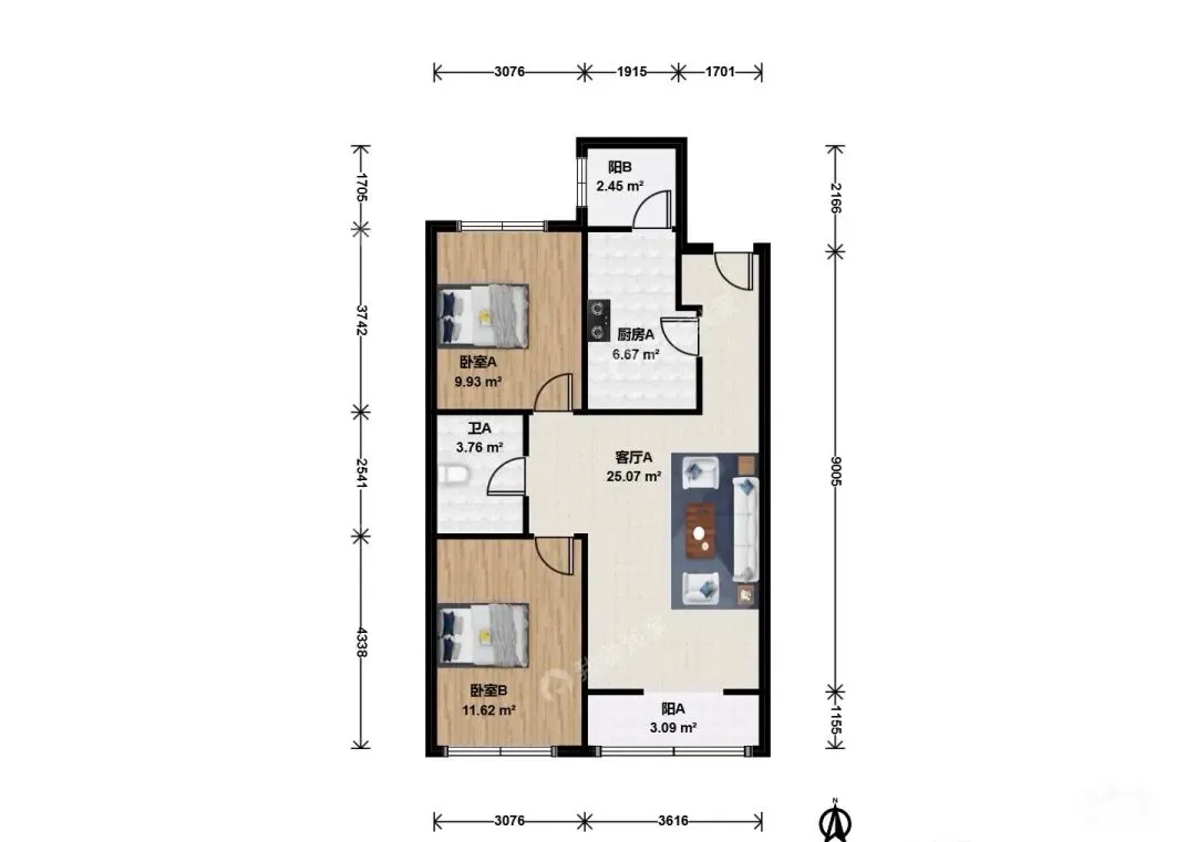 户型:91平南北通透2居