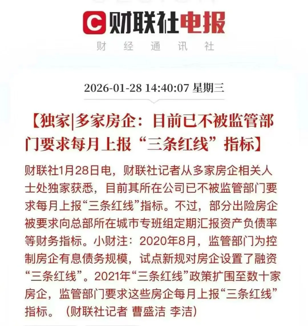 财联社2026年1月28日电:多家房企目前已不被监管部门要求每月上报“三条红线”指标,目前其所在公司已不被监管部门要求每月上报“三条红线”指标。不过,部分出险房企被要求向总部所在城市专班组定期汇报资产负债率等财务指标。