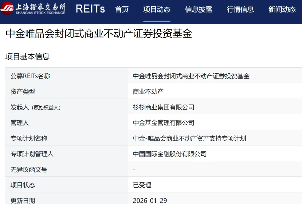 上交所官网显示,首批三支商业不动产REITs项目获受理,分别是汇添富上海地产封闭式商业不动产证券投资基金、中金唯品会封闭式商业不动产证券投资基金以及华安锦江封闭式商业不动产证券投资基金,预计募集总额131.75亿元。 中金唯品会REIT的不动产项目为郑州杉杉奥特莱斯项目和哈尔滨杉杉奥特莱斯项目,预计募集规模为74.7亿元;