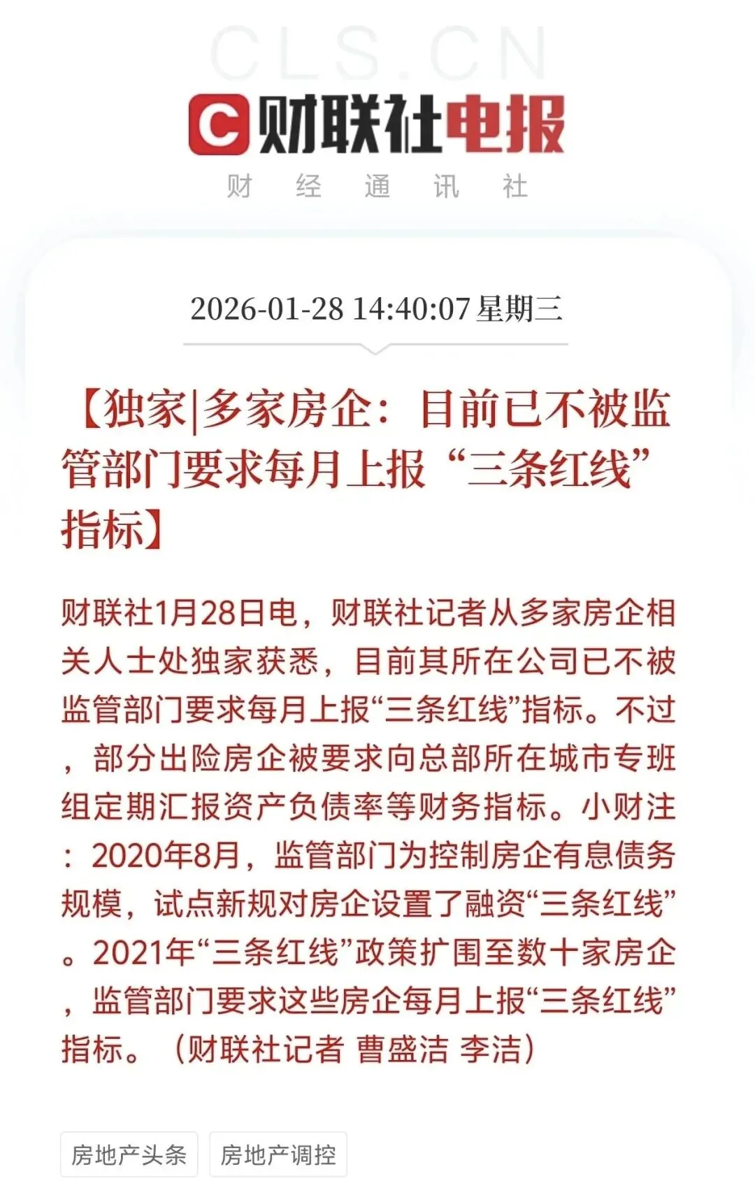 · 本次调整:多家房企(包括大中小型、各类所有制及经营正常的房企)被口头告知,自2026年起,无需每月上报“三条红线”相关指标。