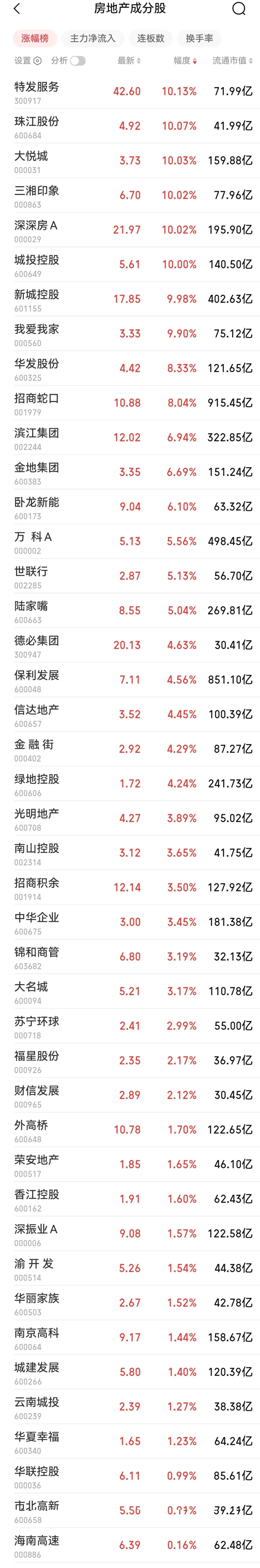 A股市场同样走强,房地产ETF盘中涨近4%。特发服务、大悦城、珠江股份等多只股票涨停,万科A上涨5.56%。
