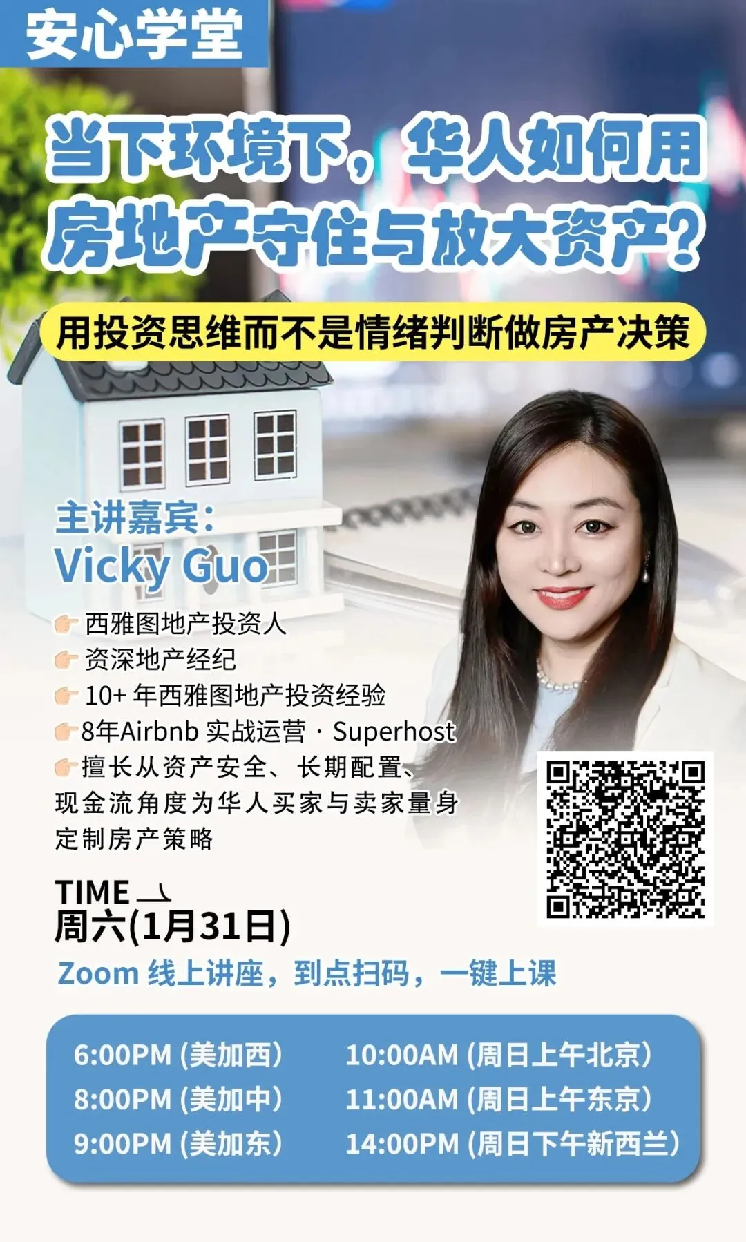 买房是普通人最大的投资,别让情绪做决定!本期讲座Vicky Guo老师将为你理清思路,告诉你在当下环境下,华人如何用房地产守住与放大资产?用「投资思维」,而不是「情绪判断」做房产决策!