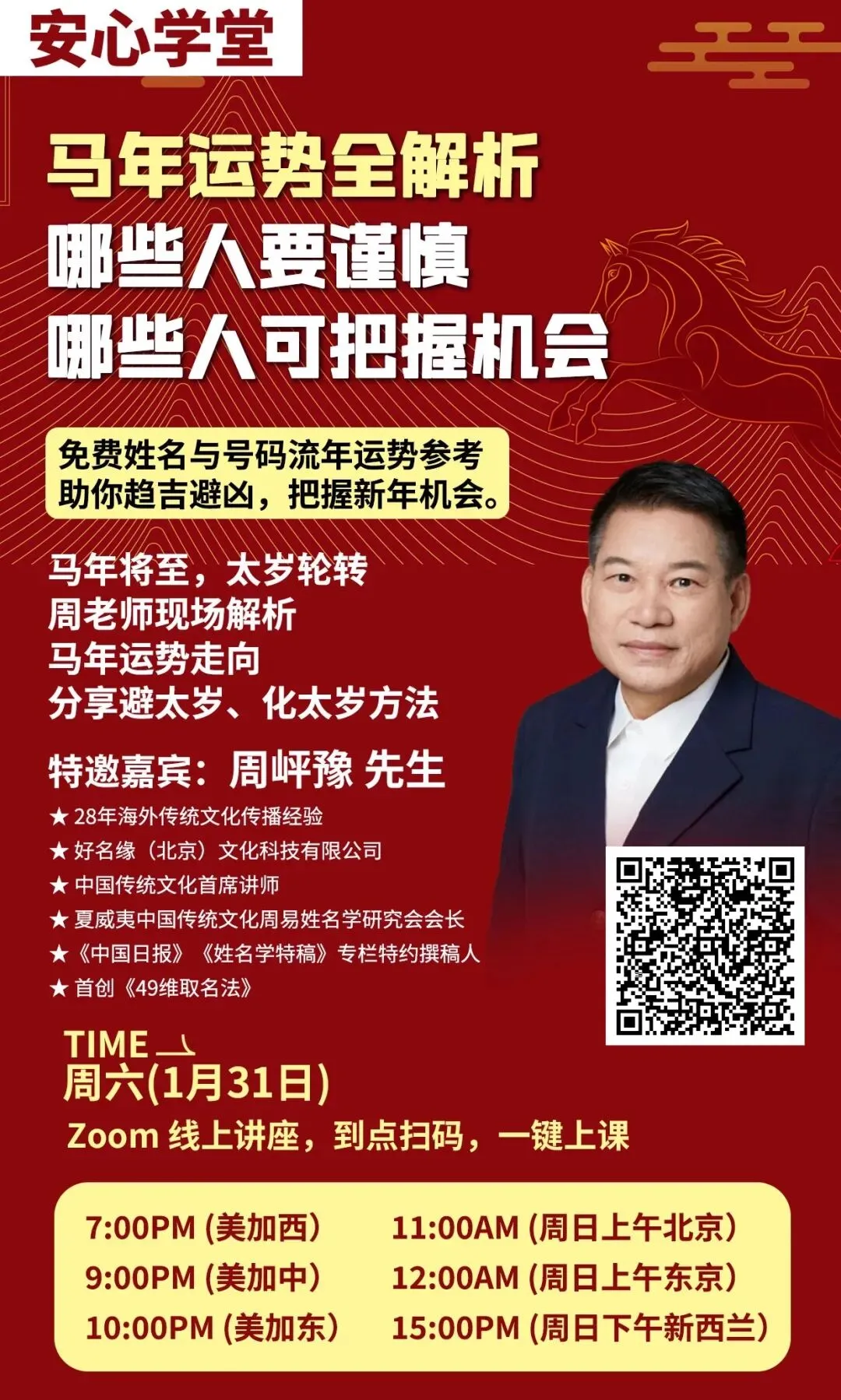 另外,马年将至,太岁轮转!周先生将现场解析马年运势走向,分享避太岁、化太岁方法!助你趋吉避凶,把握新年机会!