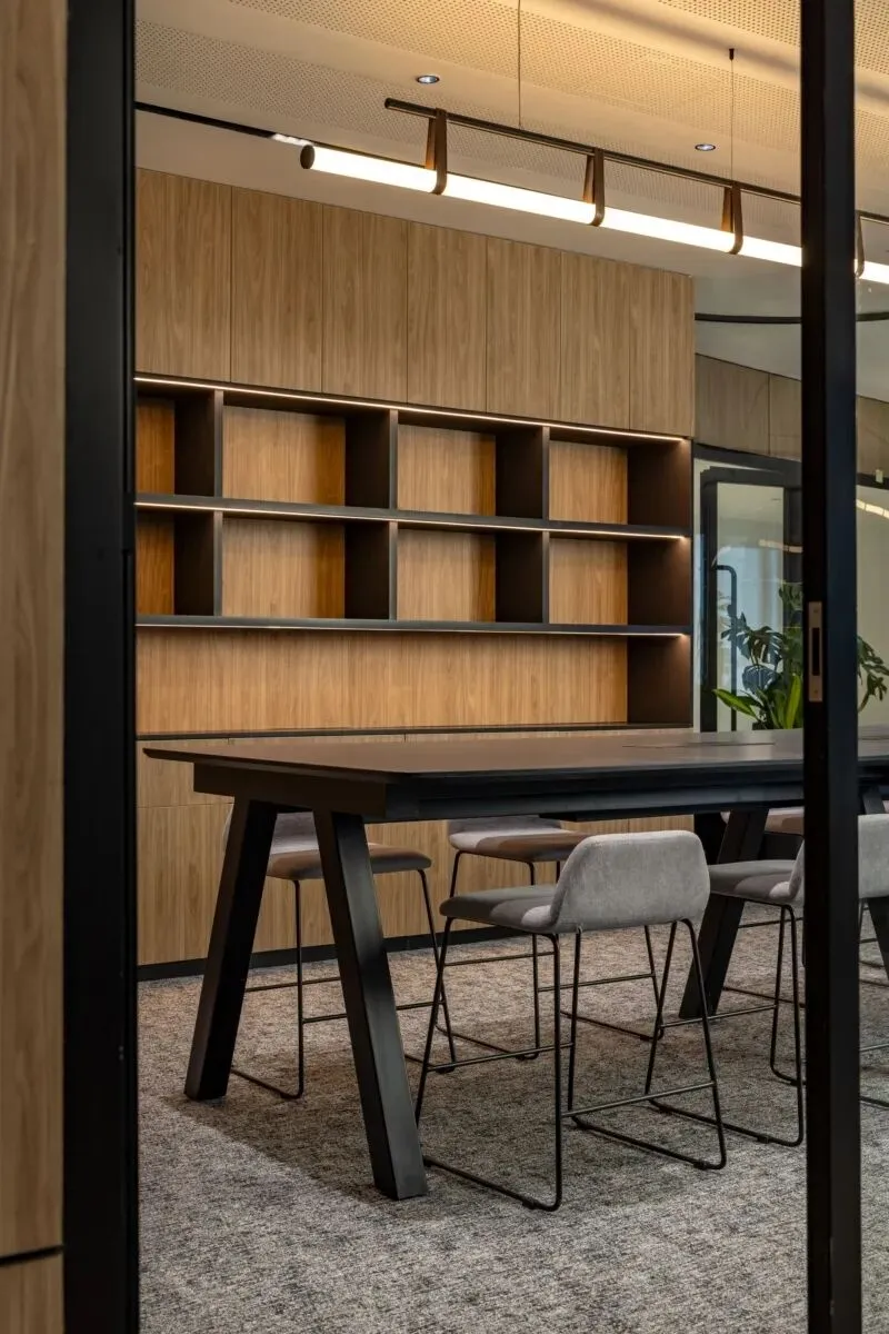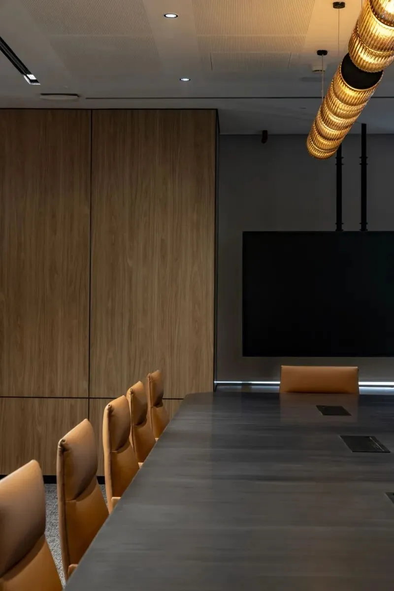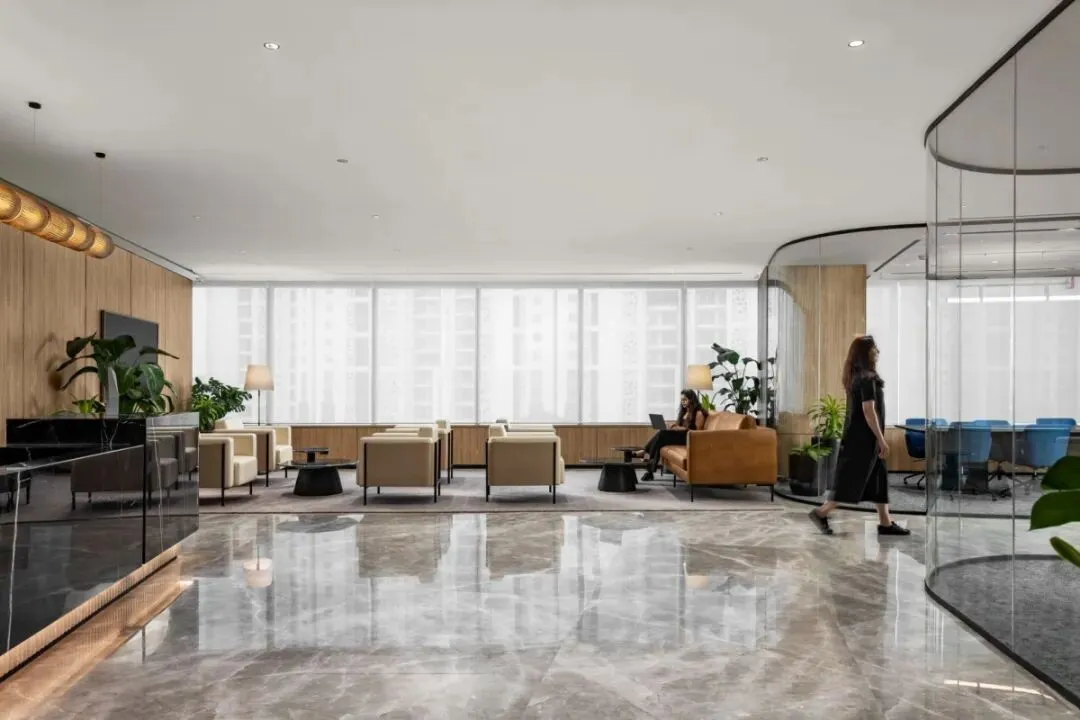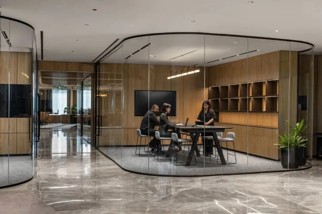 空间规划体现了以人为本的设计理念。开放式布局融合了通透性、符合人体工学的动线和层次丰富的体验。人流自然地从公共协作区过渡到私密空间,弧形玻璃隔断、隔板式天花板和材质过渡巧妙地引导动线,界定了空间层级。灰色地板、温暖的大理石和带有黑色及黄铜装饰的木质层压板相得益彰,平衡了质感和温暖感,并巧妙地强化了品牌奢华与待客之道的品牌形象。