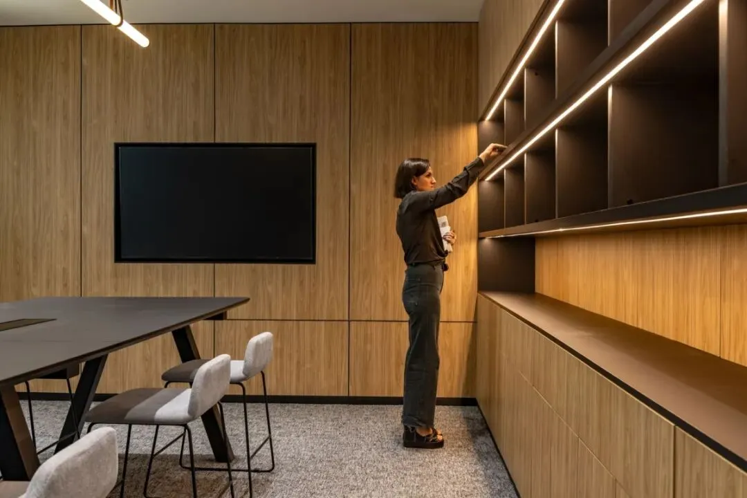 餐厅是办公场所的核心,设计、社群和员工福祉在此交汇融合。以一座融合了仿生元素的雕塑柱为中心,搭配温暖的木材、黑色表面和悬浮式灯具,这里便成为一个充满活力的社交中心。该项目颂扬材料的诗意,每一个动作、每一个角落、每一个细节都经过精心雕琢,旨在创造沉浸式的体验。