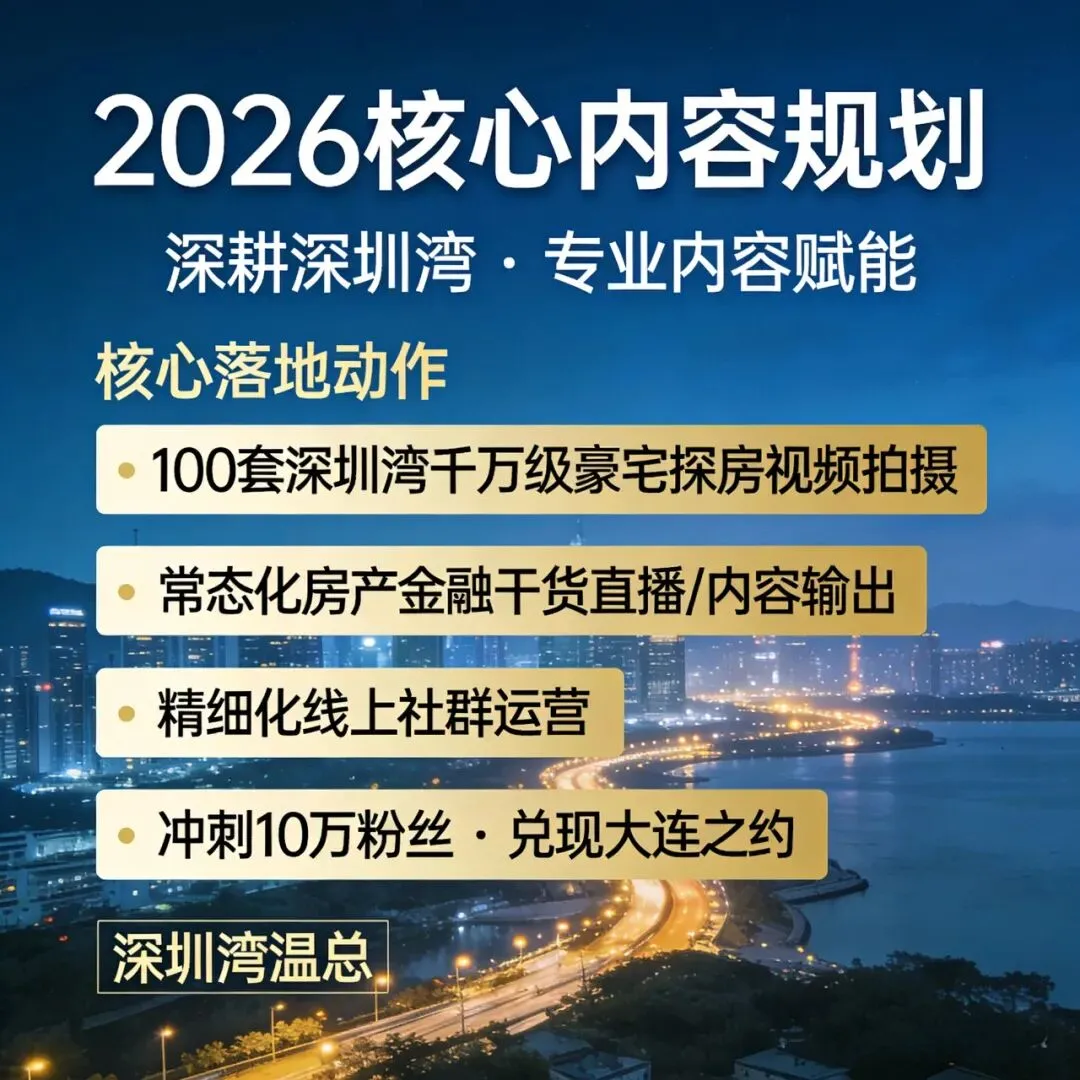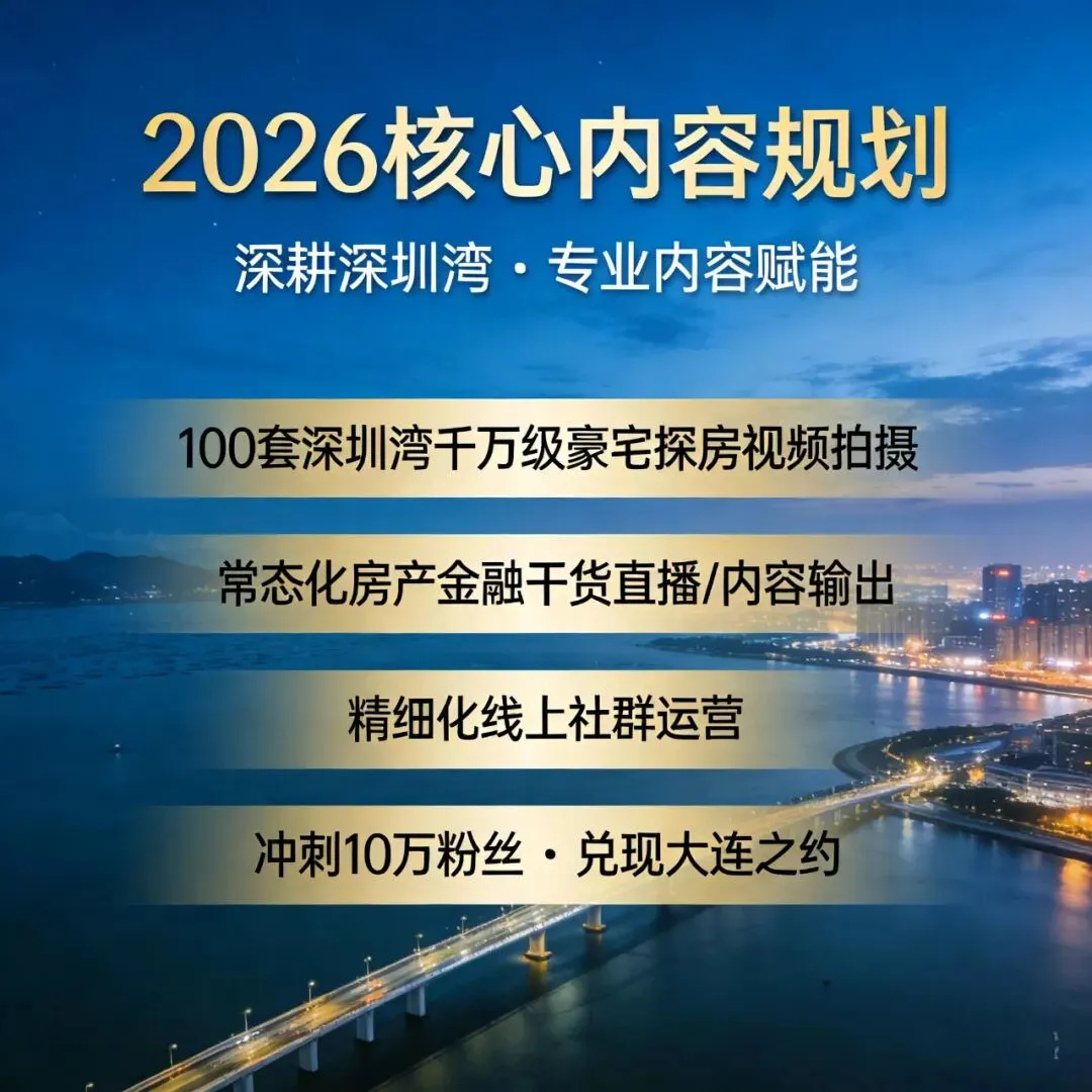 这份收获,离不开每一位家人朋友的陪伴与支持,也让我更加坚定了深耕房产金融自媒体IP的决心:后续将稳步推进100套深圳湾千万级豪宅探房视频的拍摄与更新,持续输出优质、落地、专业的房产金融干货内容,做好常态化直播分享,用心运营线上社群,以20年的实战经验为根基,朝着10万粉丝的目标全力冲刺,用专业的能力,为更多普通人的资产优化保驾护航,帮大家在房产金融的路上少走弯路、实现资产稳健增值。