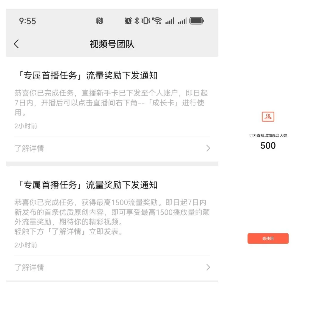 我的用心与专业,也得到了微信官方的高度认可与重磅奖励。此前,我的账号因内容优质、专业度高,被微信官方评定为具备较大直播潜力的主播,收到了官方的“翻牌子”认可;而本次直播结束后,官方专属流量奖励也如期到位:总计2000流量券,其中1500流量券可用于视频号发视频时的精准引流,500流量券可用于后续直播时的流量加持。这份奖励,既是对本次首播的肯定,也为后续的IP流量增长注入了强劲动力,让我对接下来的内容创作和直播分享更有信心、更有底气。