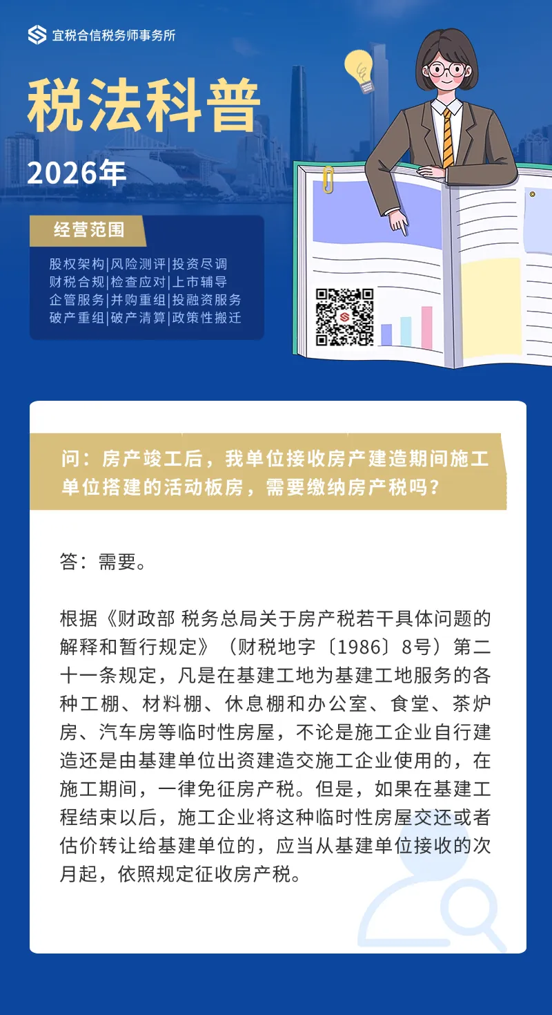 >每日科普|房产竣工后,我单位接收房产建造期间施工单位搭建的活动板房,需要缴纳税吗?